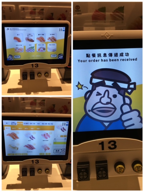 去到門口仍然要等幾張, 不過好快就有位! 入到位, 望見眼前呢部落單機, 雖然係新接觸, 但好快已知道點用 - 輕觸式螢幕, 看圖落單, 見到右邊畫面就知道點餐成功落左單後好快就有野食, 食物送黎前, 眼前呢個小黃圓燈就會閃, 仲有提示聲響, 火車就會每次送最多四碟食物去你號! 唯每次點餐都有限數(唔太記得幾多碟)