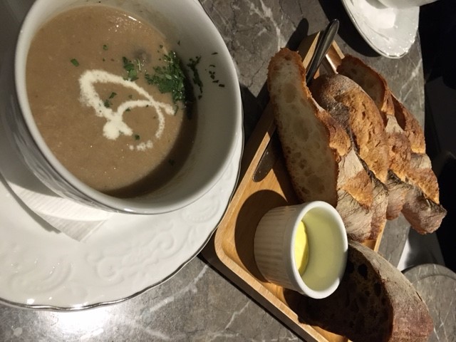 加多$30, 可包餐湯/沙律, 我地一致要晒餐湯(今晚係蘑菇湯), 配埋堅硬既面包, GOOD MATCH