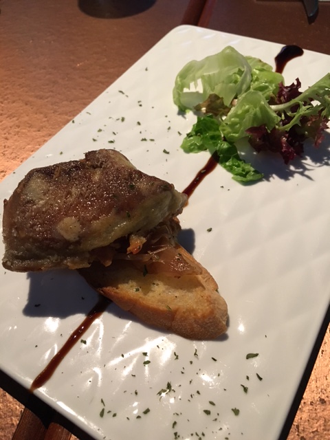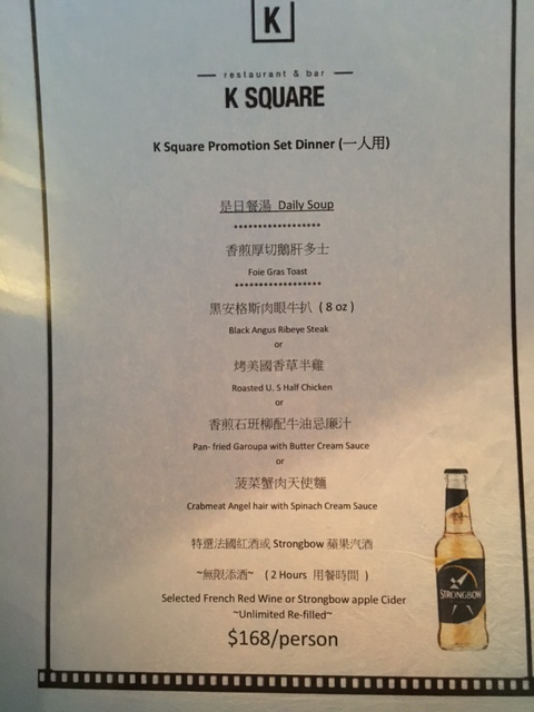 講返晚餐先, 見餐牌提供一人餐 ($168), 包是日餐湯, 香煎厚切鵝肝多士, 主菜一款及精選法國紅酒/非酒類飲品(無限任飲2個鐘)