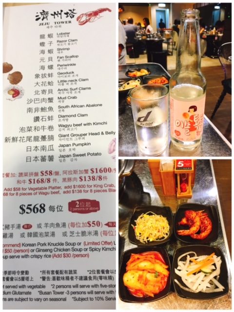 餐牌上有3款套餐供選擇, 價錢由每位$328至$568, 朋友生日一於食豪D, 點了最貴價及海鮮種類最多既濟州塔, 等食之前, 飲了侍應推介最新韓國出品既桃味氣酒, 岩晒夏天飲, 當然唔少得可以添食既前菜, 味道都唔錯