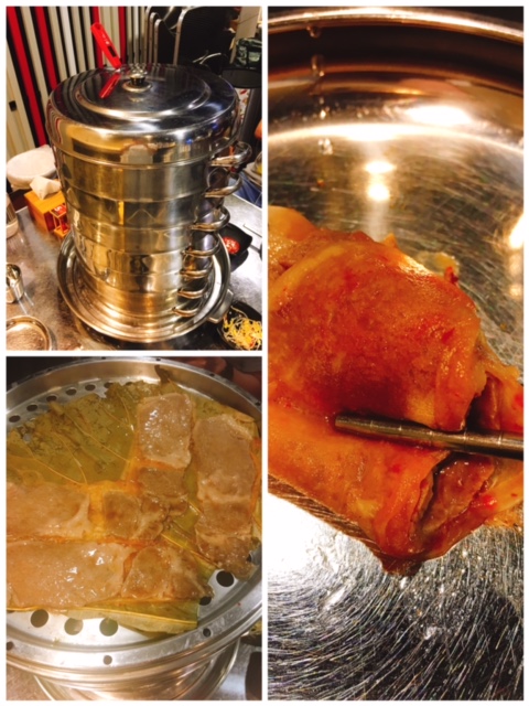 二人分享有七層塔, 當塔頂既紅色溫度計去到85度就可以開始食第一層, 第一層為泡菜和牛卷, 薄薄一片, 底層以泡菜包住和牛, 食到和牛既鮮味肉汁, 若果覺得唔夠泡菜, 可以自加前菜中既泡菜! 亦可追加和牛($168/8件)