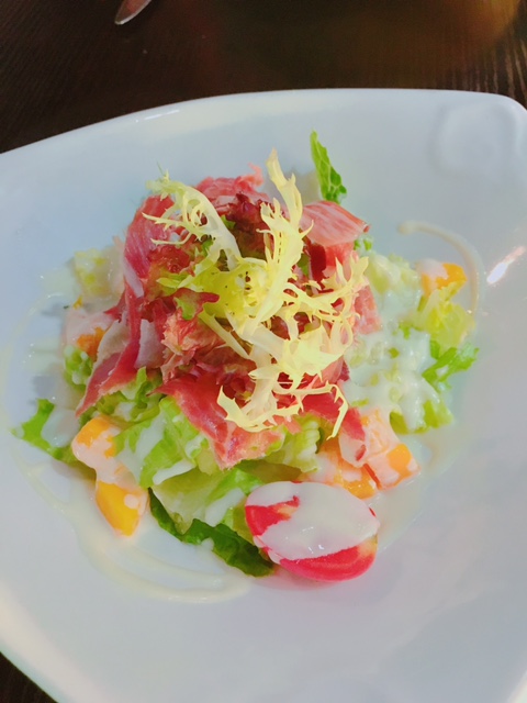 乳酪芒果雜菜沙律配西班牙48個月黑毛豬風乾腿, 清爽沙律菜加埋咸香黑毛豬風乾腿, 食到少少油香感, 配以酸甜度適中既乳酪醬汁, 夠晒醒胃