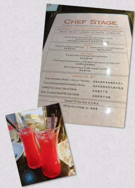 但唔緊要, 服務細心既侍應送上餐牌, 見我地二人就提議要呢個精選二人晚餐, 望落食物都幾吸引, 咁就呢個啦! 餐包2杯餐酒, 我地唔"酒", 可改為菓茶, 味道酸甜幾好入口