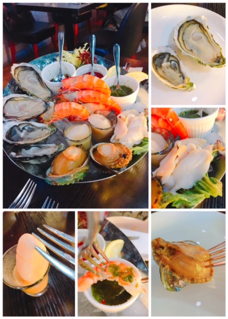 海鮮拼盤 - 食材非常豐富, 包括兩款生蠔(各2隻), 今晚呢兩款分別為南非及愛爾蘭, 咸鮮味濃, 質感幾爽身; 鮑魚(2隻), 無需點醬汁已經有味道, 肉質夠厚身, 有咬口; 鮮蝦(4隻),蝦肉爽口, 配以酸甜香草汁一齊食好清新; 日本刺身帶子(2隻), 以杯仔奉上, 十分鮮甜; 紐西蘭聖子刺身, 配以日本刺身豉油及芥辣, 口感及味道又唔同, 鮮味更顯!