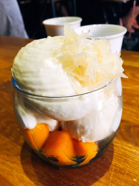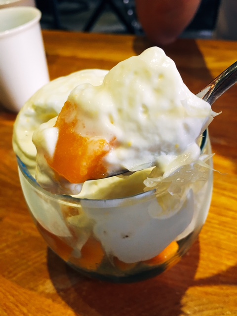 而中間係榴槤雪糕, 菓味好夠, 閉上眼覺得自己食緊榴槤咁, 而底層係芒果肉粒, 味道甜甜酸酸, 令人感覺SO FRESHING! 一客份量岩岩好, 食完唔會好飽肚!