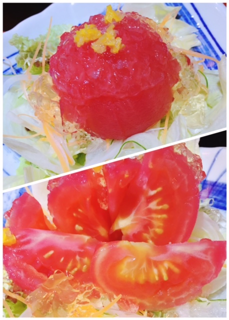 沖淡一下奶奶鷄既濃味, 推介試呢個特式凍蕃茄, 原個蕃茄去皮, 上面有D柚子皮點綴, 一咬落去鮮甜多汁, 柚子啫哩味滲滿在蕃茄中, 一食暑氣全消, 非常驚喜!