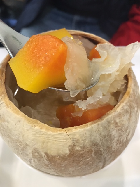 材料"釀"滿左係個椰皇入面, 甜美既木瓜粒配以爽口既雪耳, 偶然又會食到南北杏, 糖水甜度適中, 友人表示食完喉嚨舒服晒, 個人即時覺得無咁DRY...............哈!