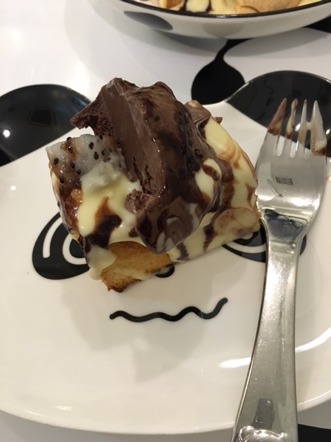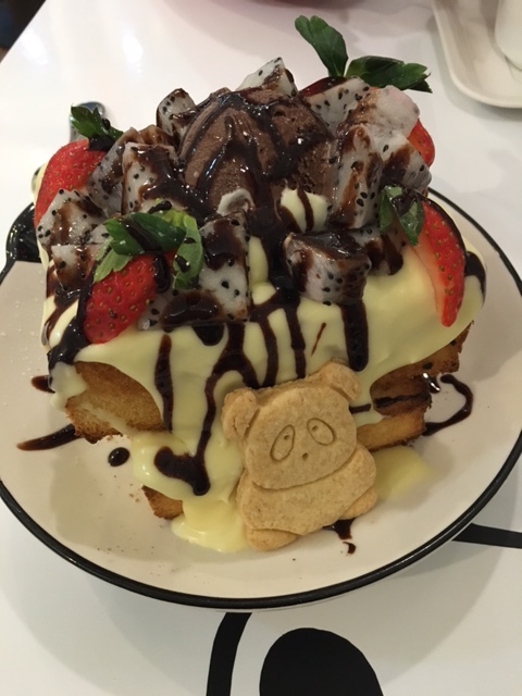 見到餐牌有吐司, 我地兩個無需商量, 一致決定要食, 咁就叫埋呢款小熊朱古力蜂蜜吐司伴雪糕($48), 賣相相當有份量, 可以自選雪糕球味道, 香脆多士上淋上朱古力及吉士醬, 底層有蜂蜜, 三者增加左香甜味! 仲有一塊熊貓曲奇作裝飾, 我地當然唔會留佢"活口"啦..............