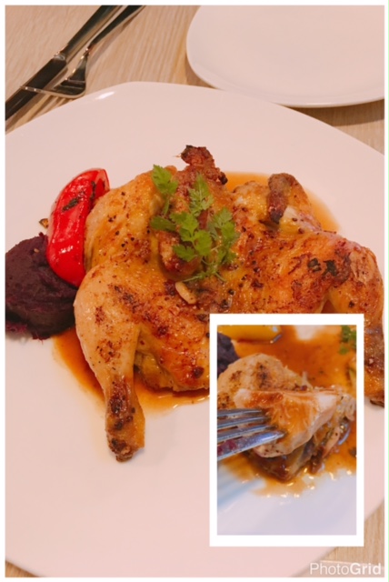 主菜有燒原隻法國春鷄 ($188), 話明係春鷄, 唔會太大隻但食落先知係好夠, 肉質嫩滑, 點少少汁食幾滋味, 最欣賞佢燒到個鷄皮香脆口又無脂肪, 食左都唔會有罪惡感