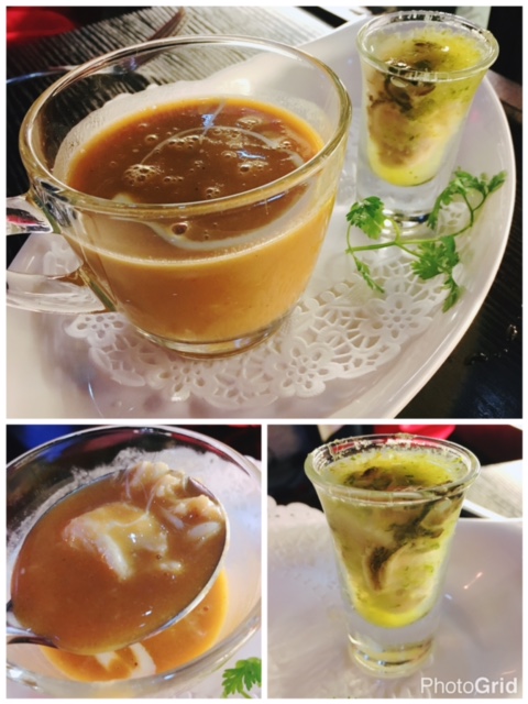 蟹肉濃湯配鮮蠔杯 ($128), 蟹湯同鮮蠔分開上, 侍應話先飲一半蟹湯, 哇.......味道超濃蟹味, 仲有蟹肉, 跟住一口食蠔SHOOTER (味道似泰式酸汁底, 蠔隻好腍滑), 估佢用意係清洗一下你既味蕾, 然後再飲埋餘下既蟹湯, 減低膩感!