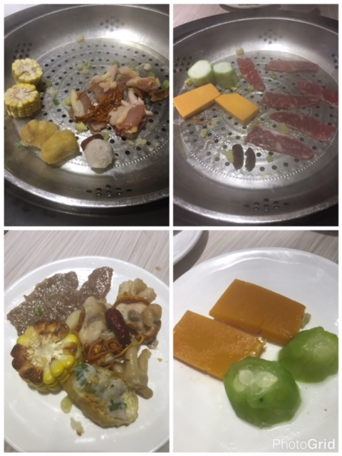 食完海鮮就可以試下手打肉丸, 蟲草花鷄, 蔬菜, 和牛片, 勝瓜, 南瓜片, 粟米等; 蟲草花鷄夠味道, 勝瓜, 南瓜片, 粟米等夠晒鮮甜, 果真清蒸最能食出食物既真味