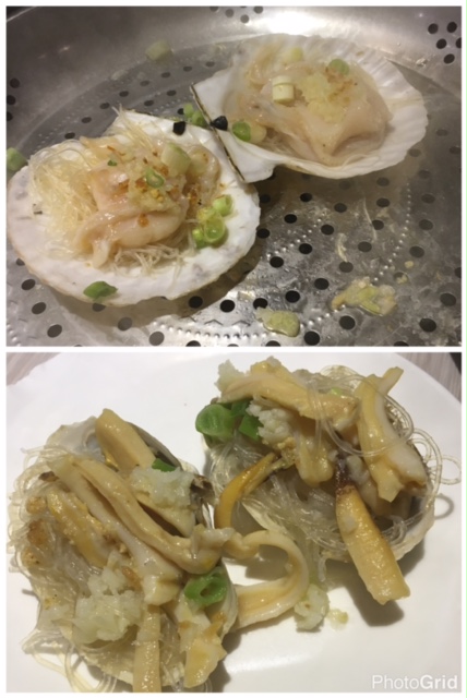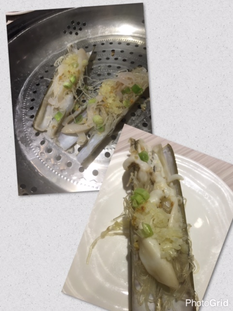 自選海鮮包括: 生猛大元貝及北韓象拔蚌 (每位一隻) - 兩者以粉絲墊底, 蒜蓉舖面係厚肉大元貝果上, 而象拔蚌切成條狀, 方便進食, 兩者都唔會蒸到過老!