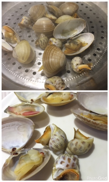3) 貝殼盛盆 - 一份有兩款貝殼類 (沙白同東風螺), 只需蒸5分鐘就食得, 沙白有D沙但味道係鮮甜既, 無需點醬汁都可以!