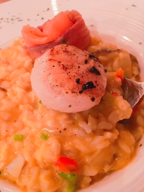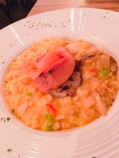 賣相靚仔既呢一客南瓜帶子意大利飯 ($128), 中間以煙三文魚捲成既玫瑰花, 底下有原粒厚帶子, 醬汁以南瓜煮爛, 加埋甜椒粒, 洋䓤粒及鮮菇, 增加香甜味道, 而個意大利飯似乎未煮得太透, 若可煮耐少少會好D!