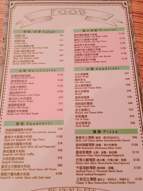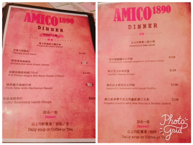 侍應送上餐牌, 見到有晚市套餐, 主菜選擇有意粉/飯, 肉類, 魚類等, 包餐湯, 沙律及飲品, 價錢都夠貼地