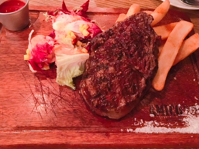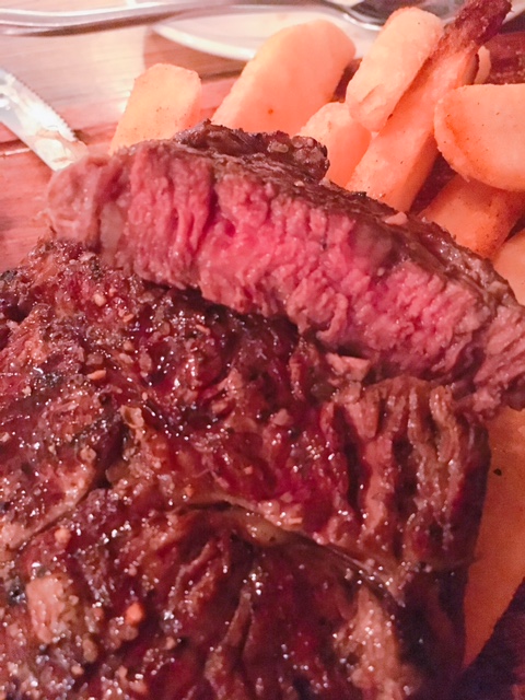 以木板上菜既呢一客美國安格斯肉眼 ($178), 配以粗大薯條及沙律菜, 份量相當吸引