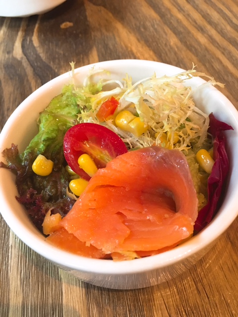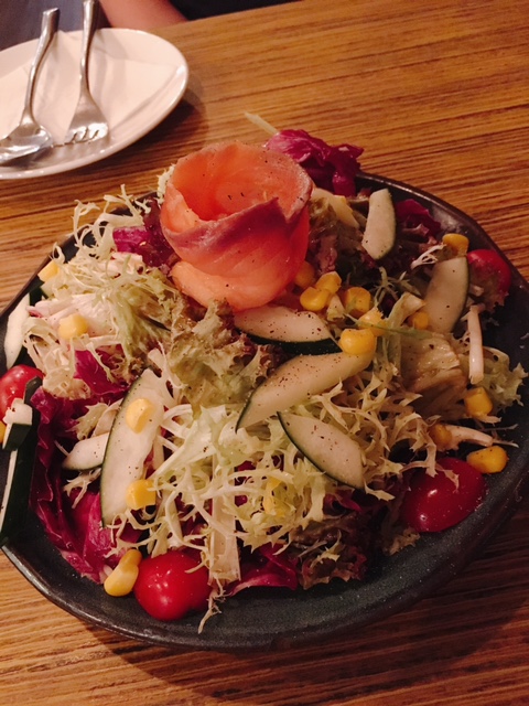 沙律係煙三文魚雜菜沙律, 咸香煙三文魚充滿油潤感, 配以開胃醋汁加爽口沙律菜, 清新一下味蕾!