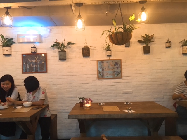 店內面積比較精緻, 昏暗燈光配以木傢俱, 白色磚牆上掛上各式綠色植物, 比人一種悠閒感覺