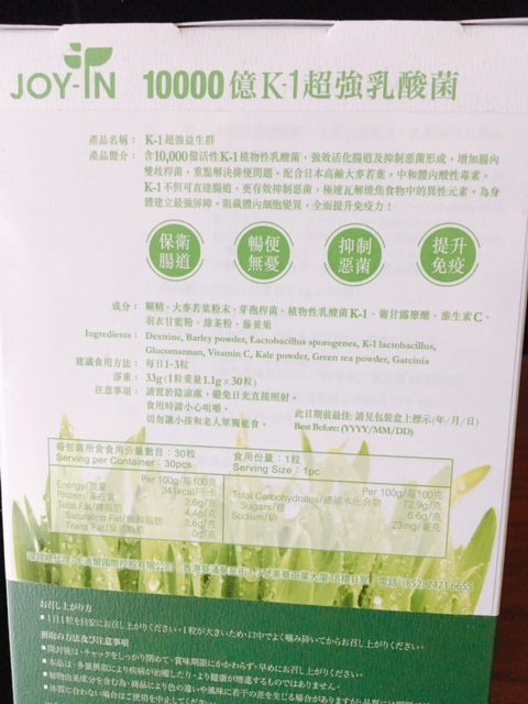 呢樽係JOY-IN 最新推出 K-1 超強益生群,日本製造, 蘊含 10,000 億活性 K-1 植物性乳酸菌首創配方,採用獨特技術為乳酸群提供防護罩,避免胃酸破壞活性,直達腸道發揮最大功效,更可阻截體內細胞變異,同時全面提升免疫力;再配合日本高鹼大麥若葉,能中和體內酸性毒素,解決便秘及維持定時暢便。
