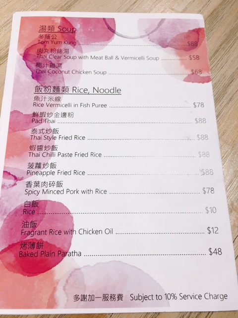 飯粉麵類選擇有幾款, 見到有Pad Thai喎, 一於試下呢碟鮮蝦炒金邊粉 ($88), 伴碟有花生碎及青檸, 賣相幾吸引! 呢碟以蝦, 豆腐干粒, 椰菜, 蛋絲炒製而成既金邊粉, 將花生碎撈均及唧少少青檸汁調下味就食得! 蝦食落口感偏硬少少; 金邊粉炒得唔夠乾身, 食起上黎有少少漿口感覺, 雖然味道帶酸甜但都未能成功提高清晒成碟既能力!