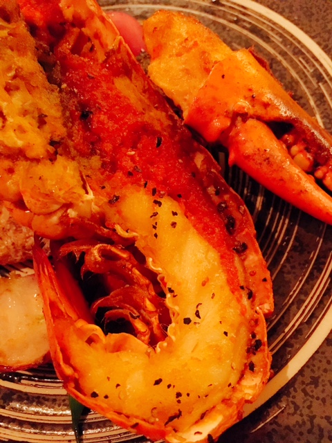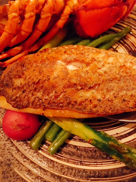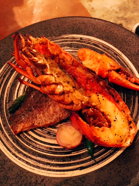 主菜係呢客燒本地鮮魚柳配燒波士頓龍蝦半隻伴香蒜牛油汁, 擺盤精美, 雪白龍蝦肉配上橙紅色龍蝦籽, 份外迷人, 肉質頗彈牙; 件魚柳薄薄一片燒得皮脆肉嫩, 食落有少少咸鮮味, 好好味; 另外個香蒜牛油汁搽左落個食材到先燒, 增加佢既誘人程度!