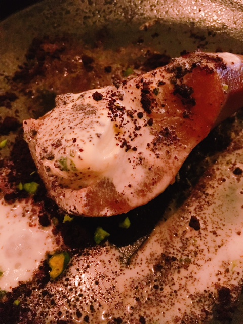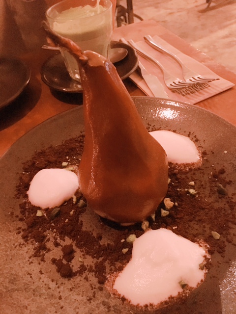 食到呢度, 當然唔少得要埋甜品啦, 呢客係餐廳招牌甜品 : 咖啡煮啤梨配朱古力金寶及開心果碎, 賣相靚仔