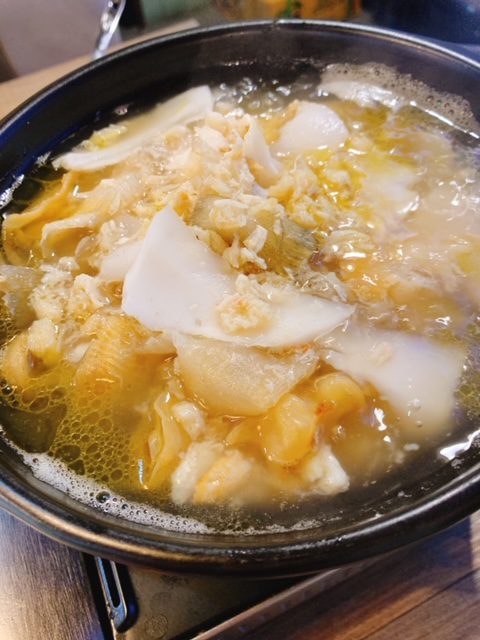 食到蝦,魷魚,豆腐,菜及草菇粒,打埋個蛋白"獻"汁,飲完兩碗成身暖晒。