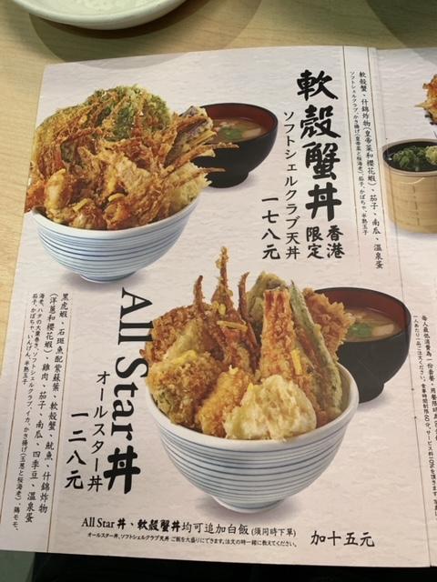 丼嘅選擇大致有四款,價錢最貴係$168,軟殼蟹丼寫住香港限定