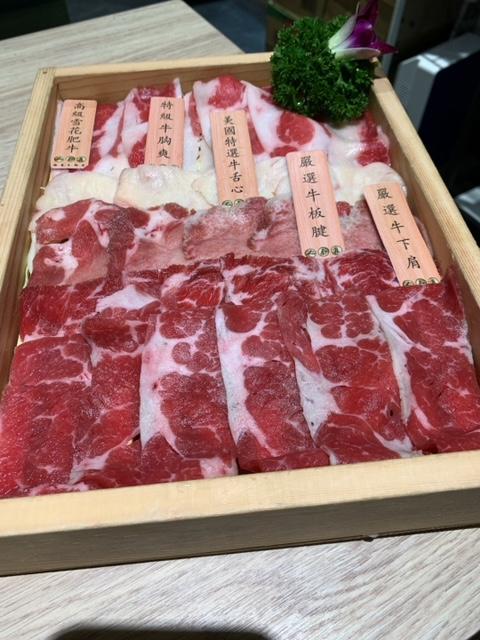 送上高級牛肉一客,包括牛下肩,牛板腱,牛胸爽,精選牛舌及雪花肥牛,有埋名牌知道食緊咩