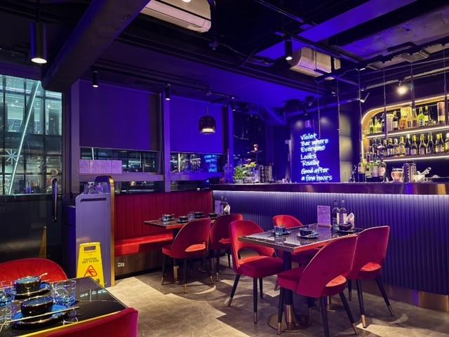 大大個酒水吧位,放滿吸睛嘅各式酒類,紫紅色傢俱主題,亦有戶外露台區可以出去飲杯野。