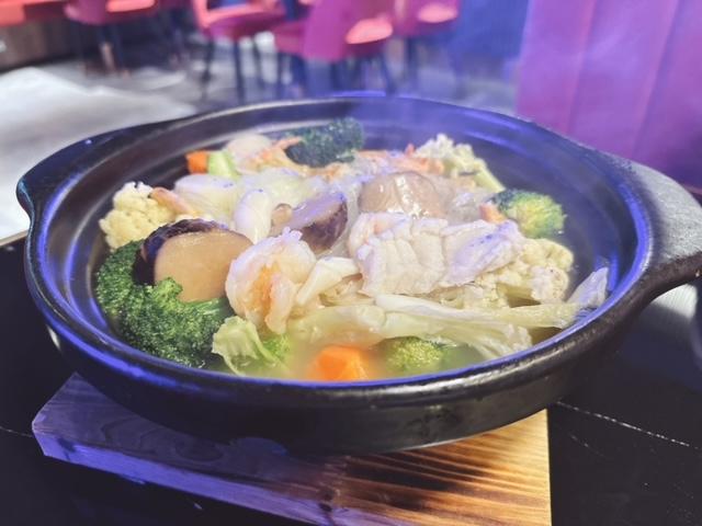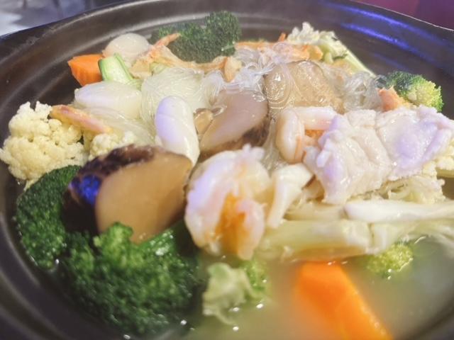 海鮮包括有帶子,魚塊,魷魚,蝦球及蝦乾; 西蘭花,椰菜花,娃娃菜,紅蘿蔔及鮮菇,仲有粉絲,份量十足。