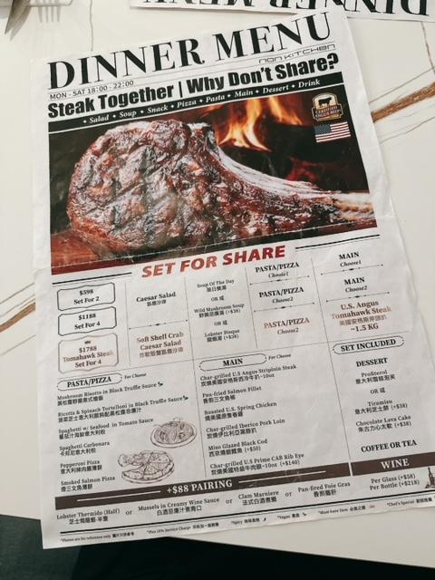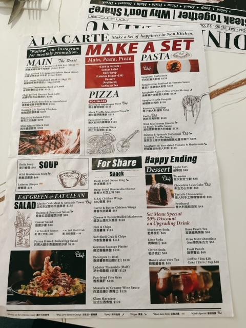 主菜係肉類及薄餅或意粉類各選一項,今晚餐單如下: