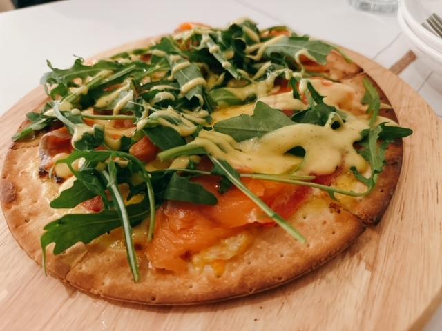 首先出場係煙三文魚薄餅,切成6件,即叫即焗