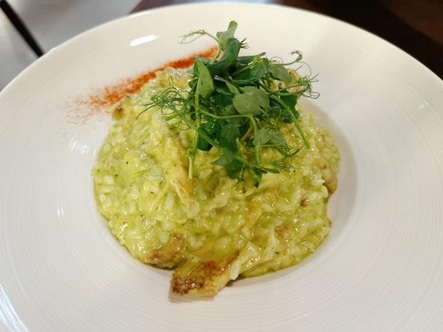 主食分別叫咗青醬鷄肉燴飯 ($93),白碟配綠調食物,視覺上幾和諧