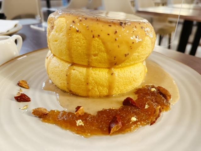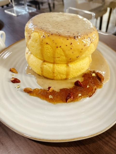 紅棗燕窩呢類中式食物,遇上西式甜品會有咩火花?! 紅棗吉士醬汁淋係兩件鬆厚梳乎厘班戟,紅棗碎及燕窩放係側邊,構圖吸引。