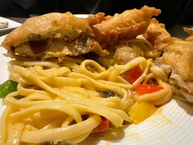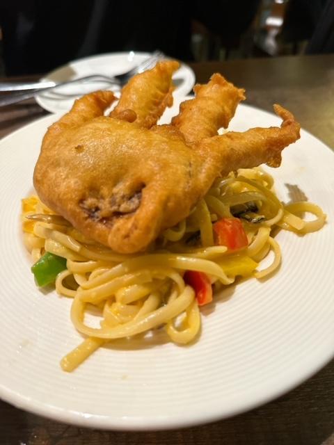 之後到意粉出場啦,呢客炸軟殼蟹南瓜忌廉意粉,被造型奇特嘅炸軟殼蟹所吸引住,成隻手咁,只不過爭咗隻”手指”。