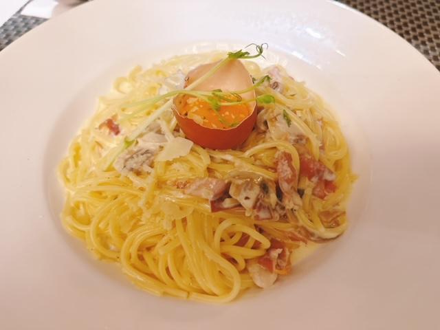 飲完湯,巴馬臣芝士煙肉蛋黃醬意粉 ($118)就出場啦。份量相當多,中間配以生蛋黃。