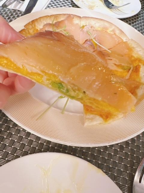 薄脆餅底,牛油果片夾在煙三文魚與芝士中,芝士嘅咸香味加埋千島醬汁嘅甜味,全部食材都係我喜愛嘅,仍然回味中。