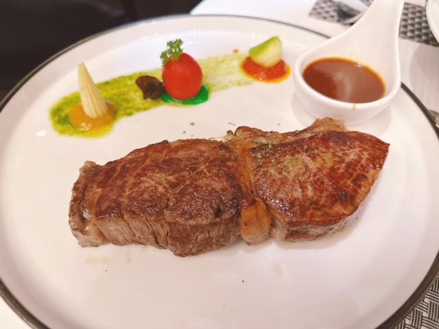 壓軸出場厚切美國黑安格斯肉眼 ($248),擺盤相當別緻,紅黃綠配菜,再有燒汁另上。