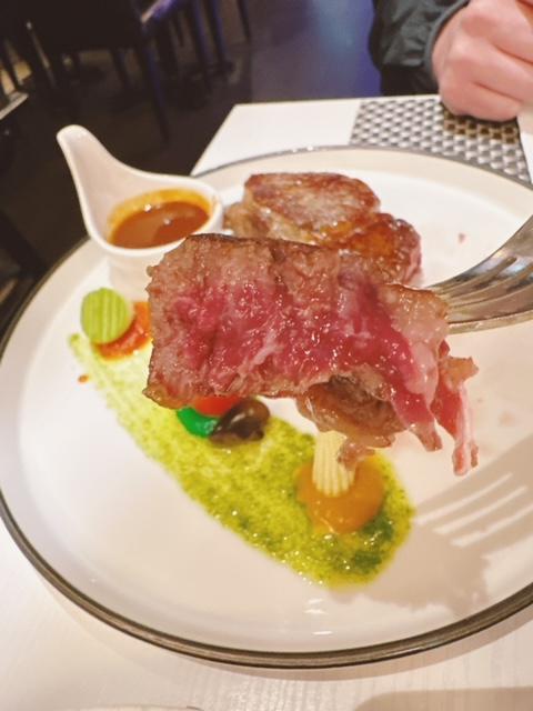 肉眼選擇五成熟,四邊煎香鎖住肉汁。切開仍然見到中間位係紅色,入口有肉汁流出黎,肉質鬆軟又帶少少嚼口,加少少燒汁調味就可以。