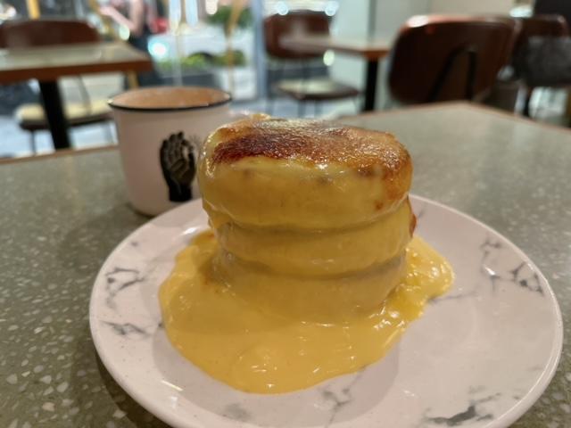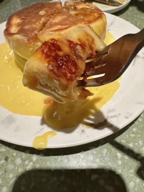 班戟口感較紮實,唔係日式空氣感,沾滿香甜幼滑嘅吉士醬一齊食,好味到無朋友。