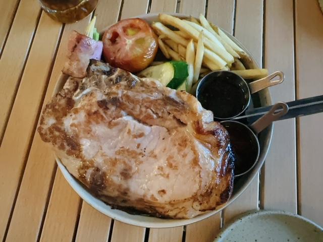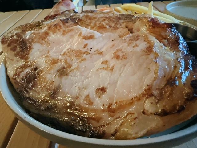 件豬扒真系相當巨型,占咗半個碟嘅位置,亦有相當厚度,煎得幾香。