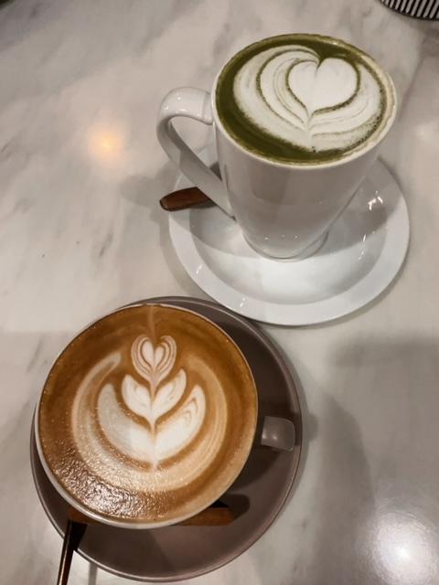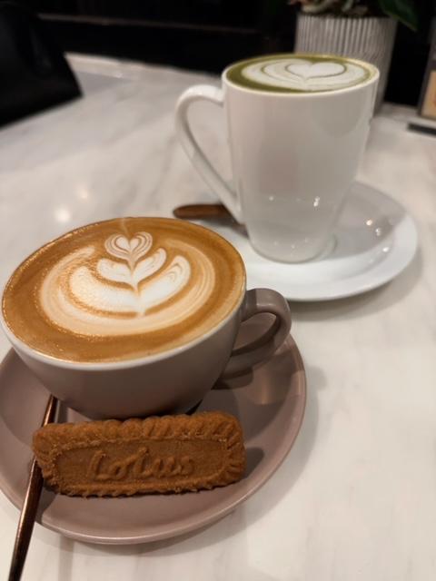 兩杯都有心心拉花,前者入口勁香抺茶味,唔太甜,咁大杯可以慢慢嘆; 後者綿滑奶泡,釋出淡淡然咖啡香味,再咬一口甜餅,正。