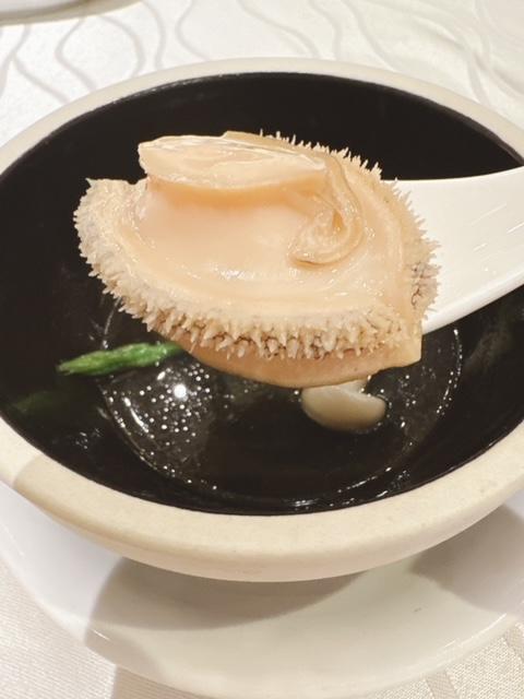 原隻南非鮑大過隻匙更,夠厚身入口帶嚼口,食到中間位置會有點咸味,配埋個清甜鮮露荀清湯,簡而清。