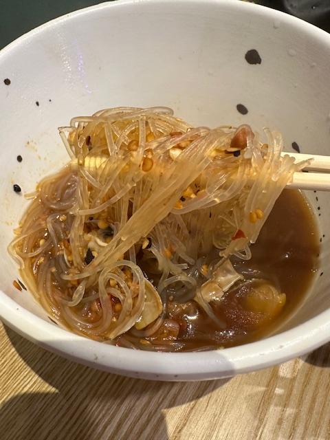 就咁食串燒驚唔飽都無需擔心,呢度有飯粉麵作為主食類。叫咗其中一款錫紙花甲粉 ($65)一齊分享。 帶點麻辣味嘅湯底,麻香多過辣,有類似粉絲配湯都唔錯; 花甲細隻但無咩沙,仲多數都有肉。