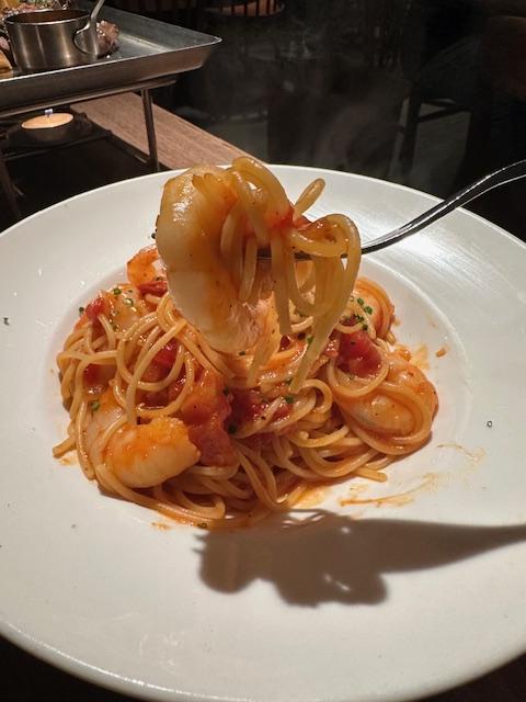 有成6隻爽口大蝦,而意粉係有口感嘅,軟硬度係我歡喜,每條意粉都沾滿咗帶有辣度及偏甜嘅醬汁,好好味,要趁熱食咗先。