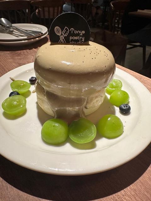 糖漿可另上,焙茶漿已淋上係梳乎厘班戟,質感相當鬆軟,食到焙茶茶香味,但整體唔會太甜; 以提子及藍莓黎清新一下味蕾,有心思配搭。