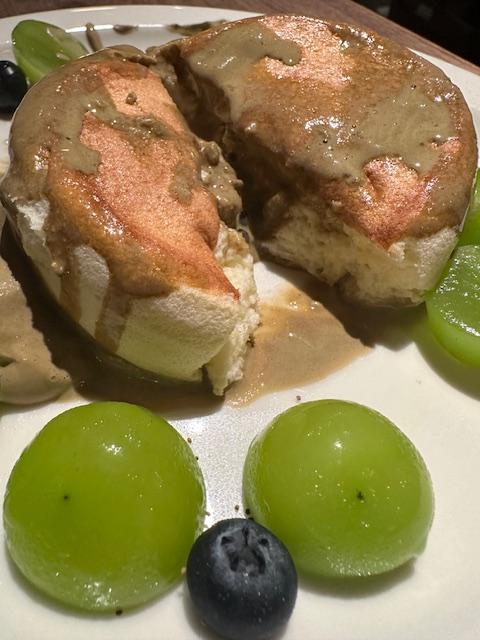 呢度提供多款梳乎厘班戟,無理由唔叫埋架?! 腦交戰咗一陣,係呢客焙茶忌廉配新鮮提子梳乎厘班戟 ($128)跑出。 只睇賣相都無得輸。