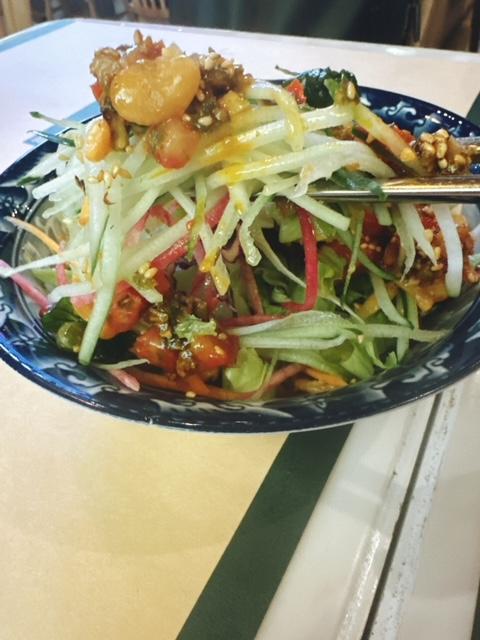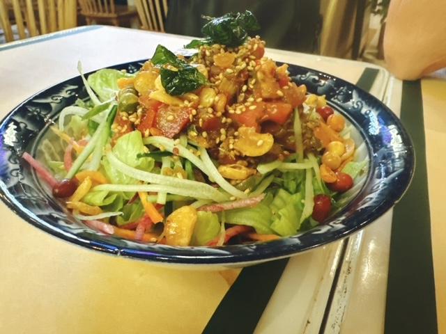 多種材料如以爽口生菜為基底,再有青瓜絲,蕃茄粒,各式脆豆及少少發酵茶葉作點綴。加入醋汁作沙律醬,爽脆之選。