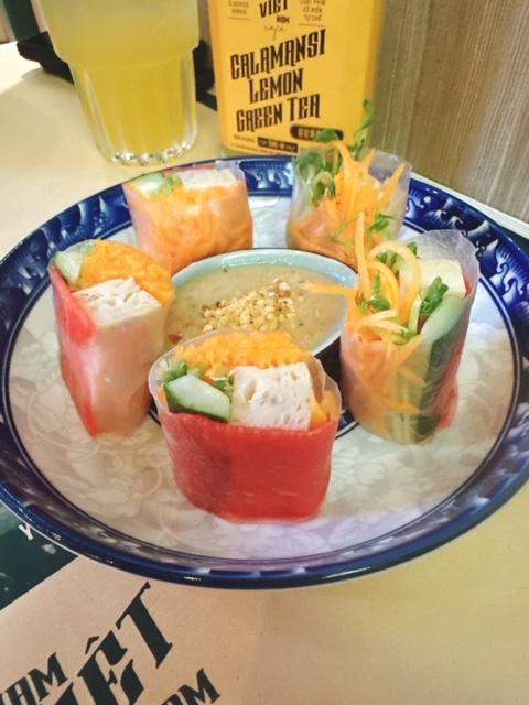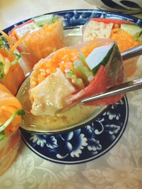 以米紙卷包住酸甜甘荀絲,青瓜及扎肉條,再點埋個花生醬,調起晒整體味道。